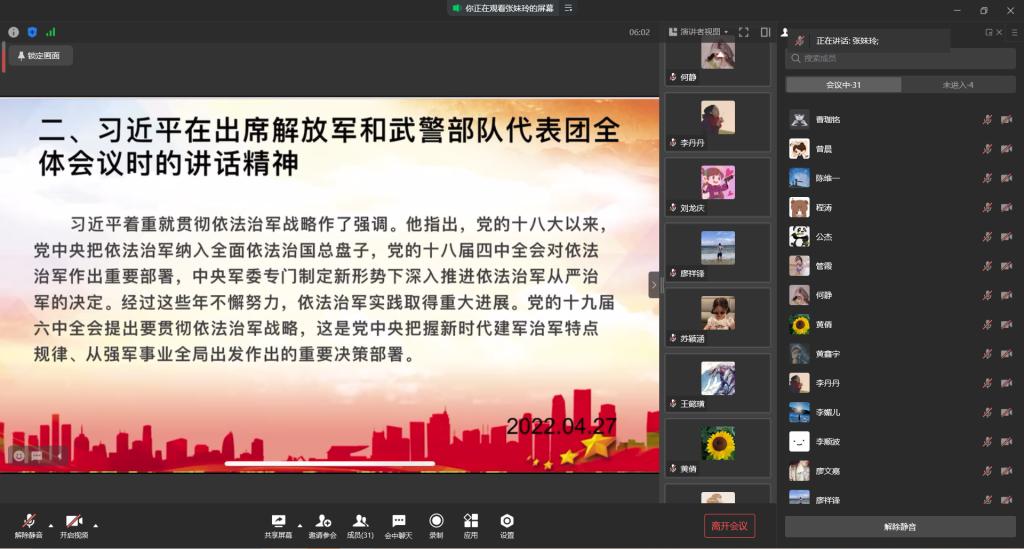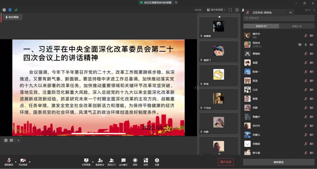 太阳集团tyc9728ok138cn太阳集团学生一支部于2022年4月27日19:00在企业微信开展了2022年四月线上组织生活会。本次会议由张妹玲同志主持,支部全体党员参与。