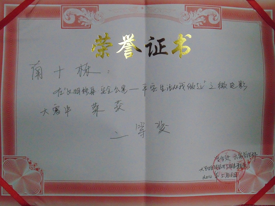 热烈祝贺我院主管南十楼栋在“文明修身·安全公寓平安生活从我做起”之微电影大赛中荣获二等奖。
