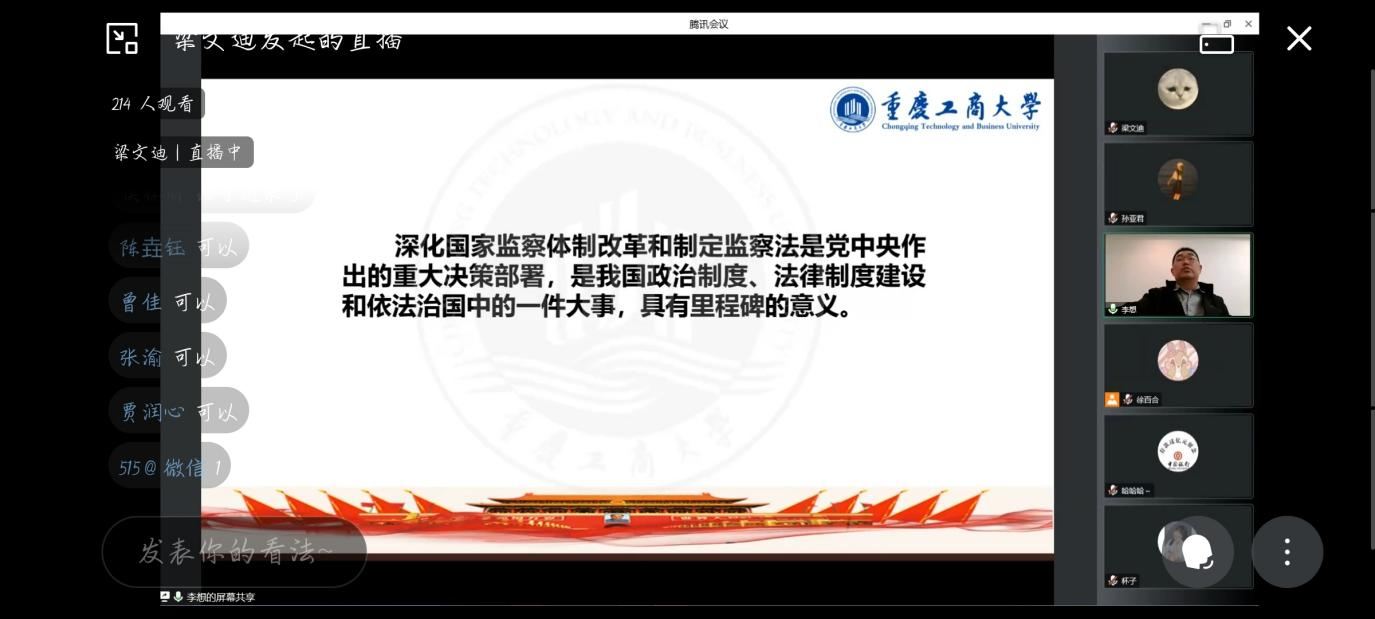 之后,在律动青年法学社、大学生廉洁文化研究会联合举办的“公生明,廉生威”廉洁文化线上宣讲活动中,重庆廉洁研究中心研究员、ok138cn太阳集团法学系教师李鹏飞担任主讲人,线上参与活动人数超过240人。李鹏飞以《中华人民共和国监察法》为切入点进行讲解,从真实案例、实际工作经验出发,引导同学们充分认识制定《监察法》的意义,进一步感受廉洁文化的熏陶,深化廉洁文化对在校大学生的影响。
