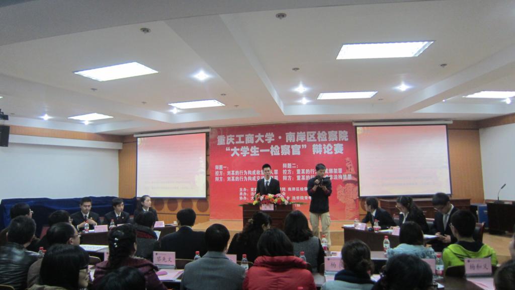 12月4日晚,由法学院和南岸区检察院共同主办的“大学生─检察官”辩论赛”在慧智楼90426模拟法庭隆重举行。南岸区检察院副检察长黎先文、副检察长邹望、纪检组长石斌、政治处主任李朝东、职务犯罪侦查局局长司智虎等一行三十余人,学校宣传部副部长杨维东、学生处副处长李莉莎、校团委副书记杨娟、法学院党总支书记李自维、法学院院长杨和义出席了本次赛事。南岸区检察院侦查监督科科长乔梅、案件管理室主任卢佳以及我校经济学院专任教师朱俊耀、法学院专任教师杨静担任了本次辩论赛的评委。