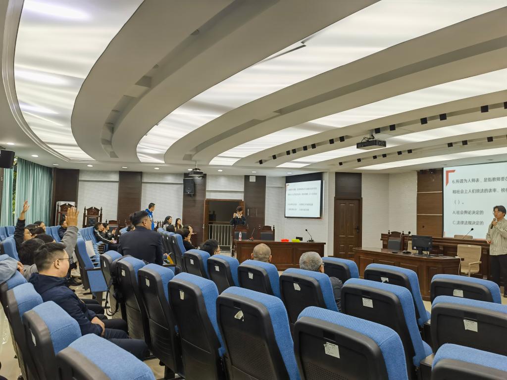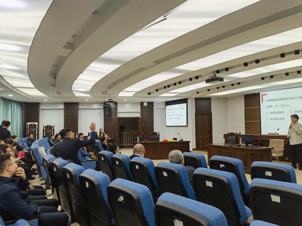 本次知识竞赛吸引了全院教职工参与,实行抢答积分制。竞赛题目包括单选题、判断题、填空题等形式,当主持人读完题目后,由老师们举手抢答。在比赛过程中,现场气氛热烈,老师们踊跃举手抢答,经过激烈的角逐,最终决出比赛一、二、三等奖。