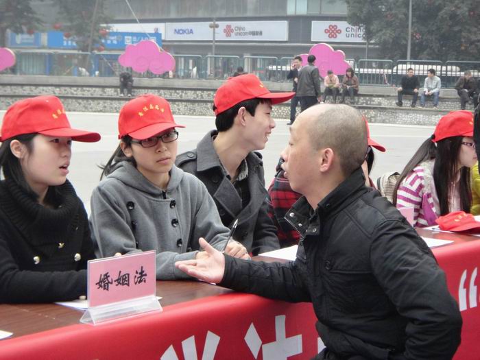 活动现场,我院设立了消费者权益保护法、侵权责任法、合同法、婚姻法、劳动法五个咨询服务台,以便广大市民更有针对性的进行咨询。记者从现场了解到,市民们最为关注的是婚姻问题,咨询内容涉及“低保”、“离婚后财产的分割”、“非婚生子女的抚养”、“婚前财产的公证”以及“婚前购置房屋的首付支付”等问题;其次是劳动法,咨询内容包括“单位养老保险的购买”、“劳资拖欠”以及“工伤”等相关问题。据统计,我院师生累计接受了30余人次的咨询。
