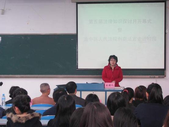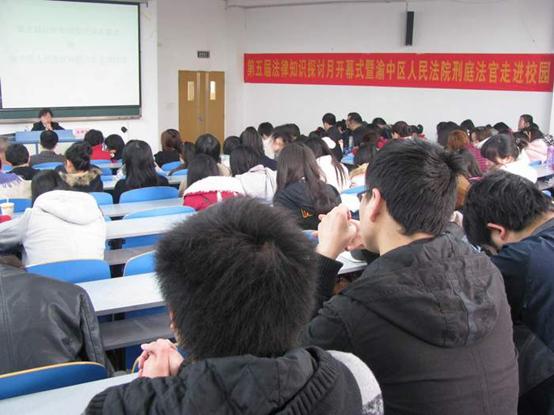 近日,法学院在慧智楼90326教室成功举行了“第五届法律知识探讨月开幕式暨渝中区人民法院刑庭法官走进校园”法律活动。渝中区人民法院刑庭庭长向鸣法官、副庭长魏小燕法官、法学院院长华鹰教授、党总支副书记李莉莎副教授、分团委书记林细妹老师以及08级全体同学出席了本次活动。