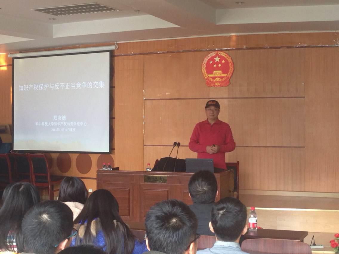 2014年12月19日下午,华中科技大学知识产权博士生导师郑友德教授应邀为太阳集团tyc9728法学院师生作题为“知识产权与反不正当竞争的交集”的专题讲座。法学院百余名师生聆听了讲座。
