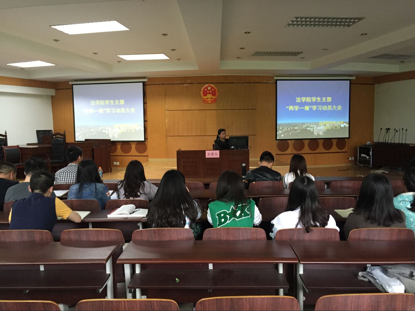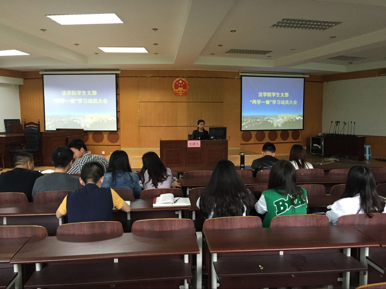 为践行中共中央《关于在全体党员中开展“学党章党规、学系列讲话,做合格党员”学习教育方案》精神,4月27日,法学院学生支部在模拟法庭召开了全体党员 “两学一做”学习动员大会。