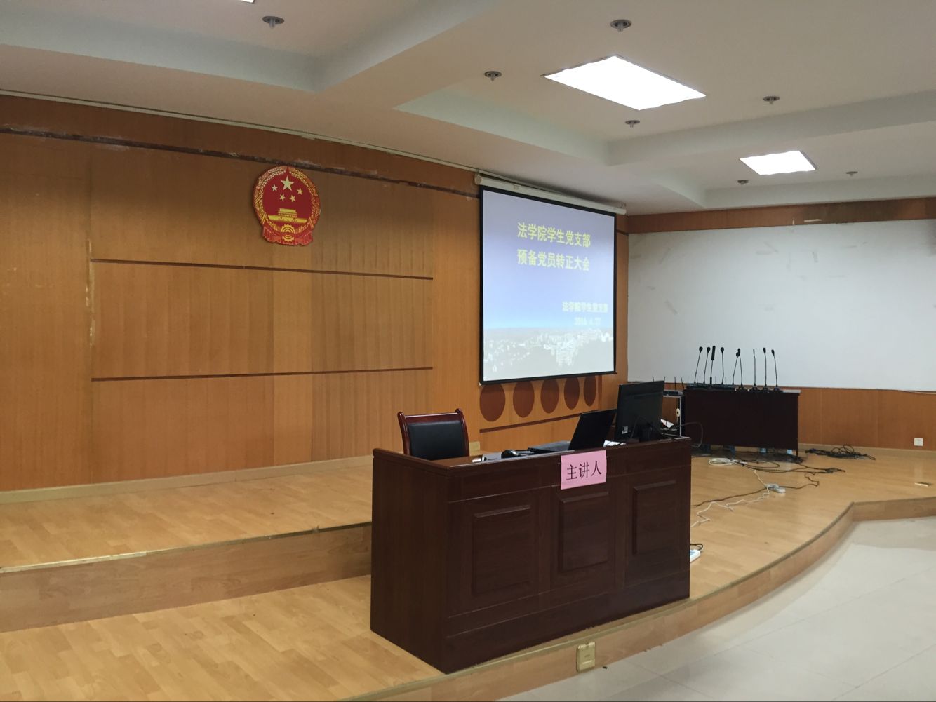 2016年4月26日,法学院学生党支部在慧智楼模拟法庭召开了支部大会,本次会议由学生支部书记杨婷老师主持。