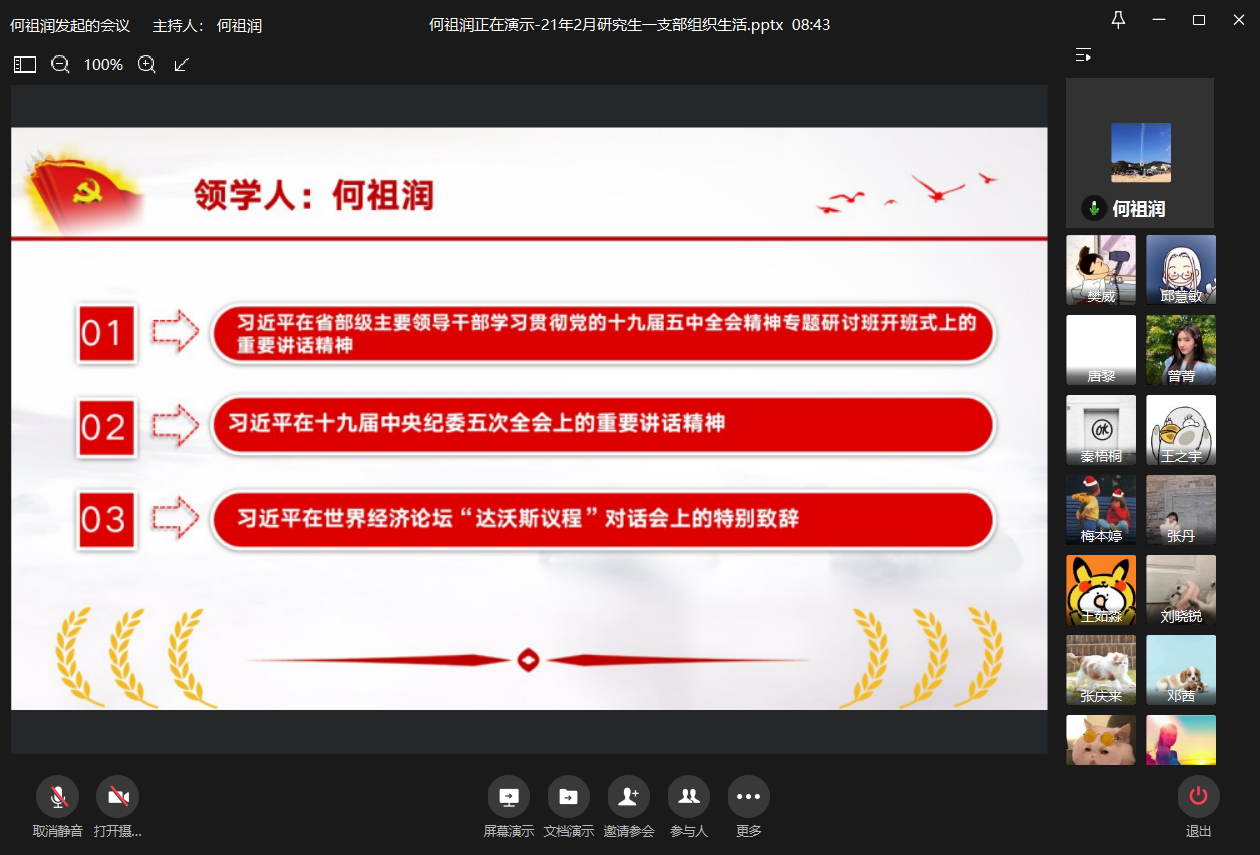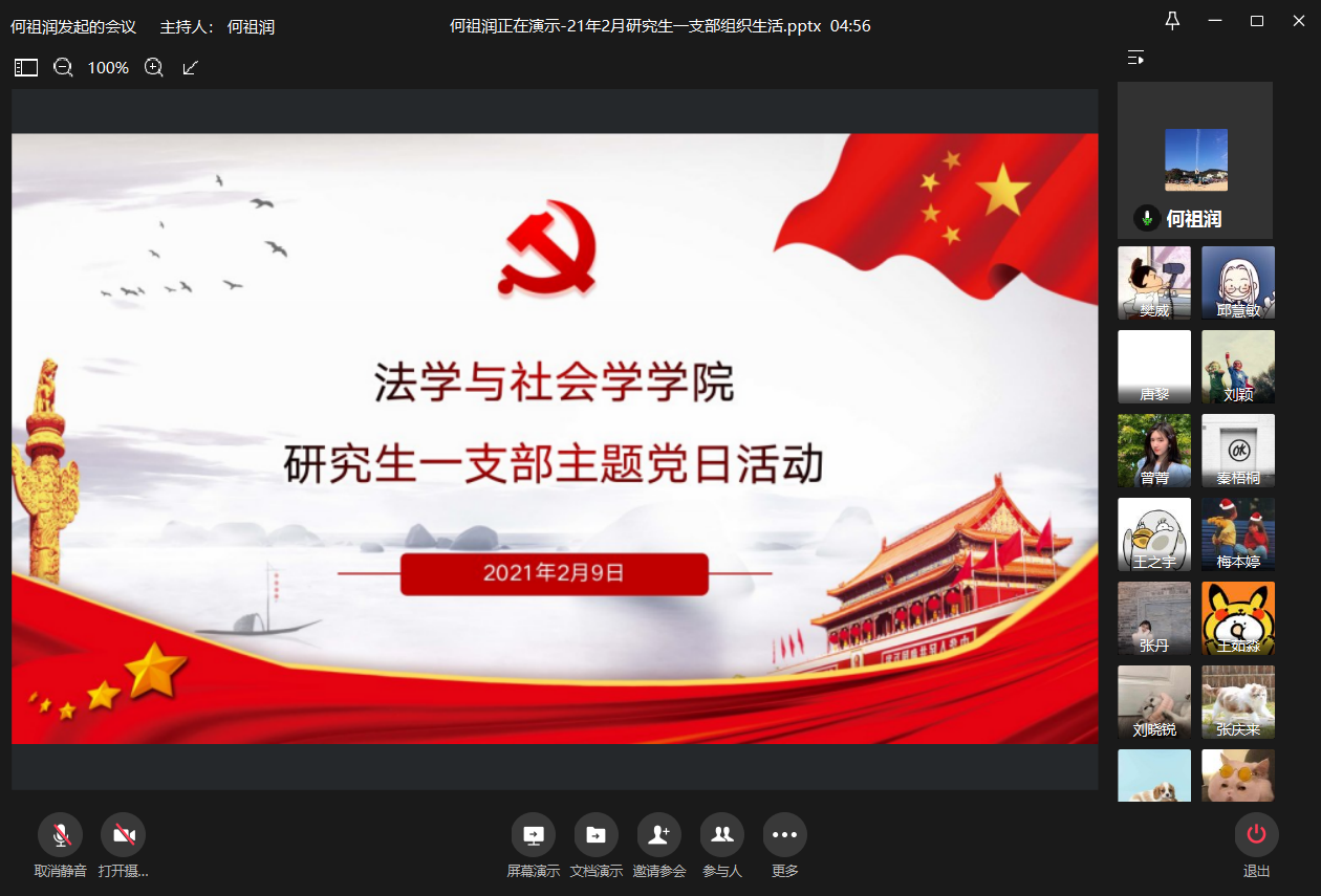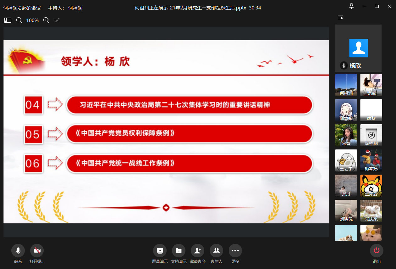 2021年2月9日上午10:00,太阳集团tyc9728ok138cn太阳集团研究生一支部通过企业微信平台在线上召开了2021年2月组织生活会。本次会议由研究生一支部书记何祖润同志主持,何祖润、杨欣、刘颖、樊威四位同志带领研究生一支部各党员进行了政治理论学习。