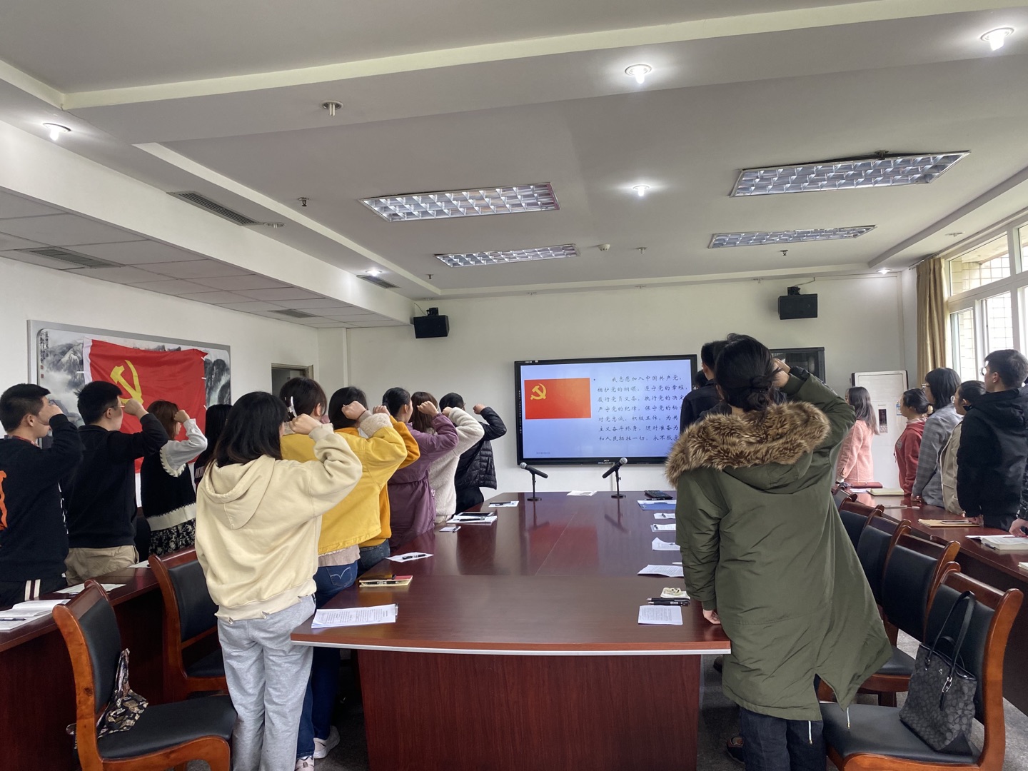 (全体党员面对档党旗宣誓)