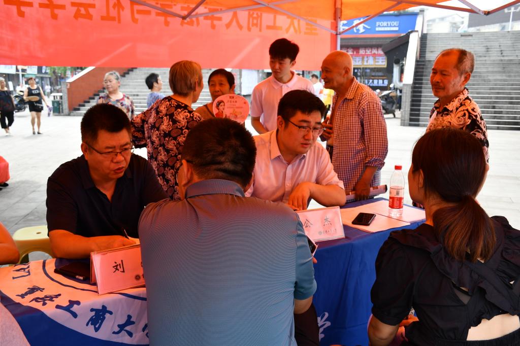 巴渝大地,七月流火!7月10日,重庆大足区碧空如洗,骄阳似火!龙水金都广场人头攒动,重庆市暑假“三下乡”社会实践市级重点团队——太阳集团tyc9728“青年普法志愿者服务实践团”活动现场挤满了男女老少,他们围着实践团队员们咨询赡养纠纷、民间借款纠纷、邻里关系、不动产所有权等与生活息息相关的法律知识,现场一派如火如荼的景象。
