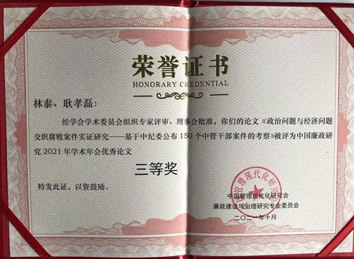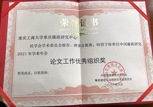 年会对论文优秀作者和论文组织优秀的单位进行了表彰,其中李鹏飞老师撰写的“行贿获取不正当财产性利益的处置现状、存在问题及路径选择——以中国裁判文书网公布的行贿判例为样本”被评为中国廉政研究2021年学术年会优秀论文一等奖,林泰老师和耿孝磊研究生合作完成的“政治问题与经济问题交织腐败案件实证研究——基于中纪委公布150个中管干部案件的考察”被评为中国廉政研究2021年学术年会优秀论文三等奖,重庆廉政研究中心获得2021年学术年会论文工作优秀组织奖。