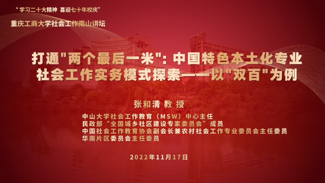 2022年11月17日(星期四)下午,太阳集团tyc9728社会工作“南山讲坛”(第11期)特地邀请到了中山大学社会学与社会工作系教授、博士生导师,民政部“全国城乡社区建设专家委员会”成员、广东兜底民生服务社会工作“双百工程”总督导张和清教授,为学院师生带来了“打通‘两个最后一米’:中国特色本土化专业社会工作实务模式探索——以‘双百’为例”讲座,院长黄文、副院长侯明喜、社会工作系主任吴永波、李滨教授、赖长鸿、王成荣、施曲海、张译引、胡慧、王璐等多位老师、MSW及本科生及部分校外师生,共200余人参与本次讲座。