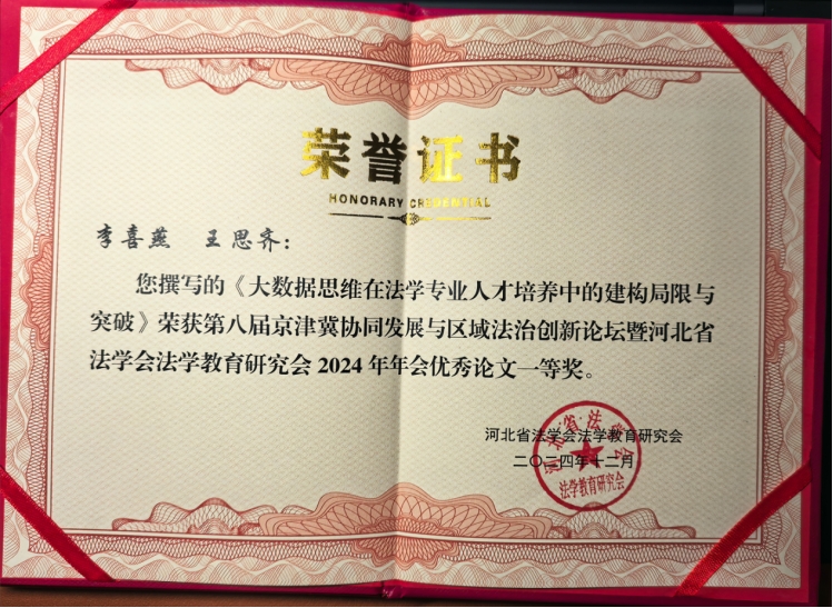 近日,河北省法学会教育法学研究会、立法学研究和犯罪学研究会召开,我院师生投稿多篇论文。我院教授李喜燕等撰写的论文《大数据思维在法学专业人才培养中的建构局限与突破》在河北省法学会教育法学研究会年会中荣获一等奖;法律硕士研究生王思齐的论文《衍生数据的刑法保护路径》荣获河北省法学会犯罪学研究会年会论文二等奖。
