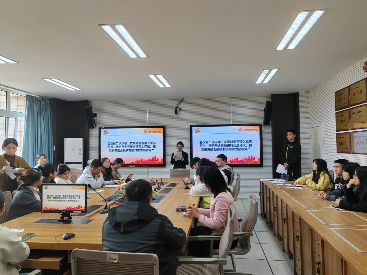 会议第一个议程,由毛瑜、焦紫依、汪庆、高玮丞四位同学依次在党员大会上宣读了入党志愿书,表达了自己入党的决心,与会党员分别对四位同志进行评议并由正式党员投票表决,同意将四位同志发展为预备党员。