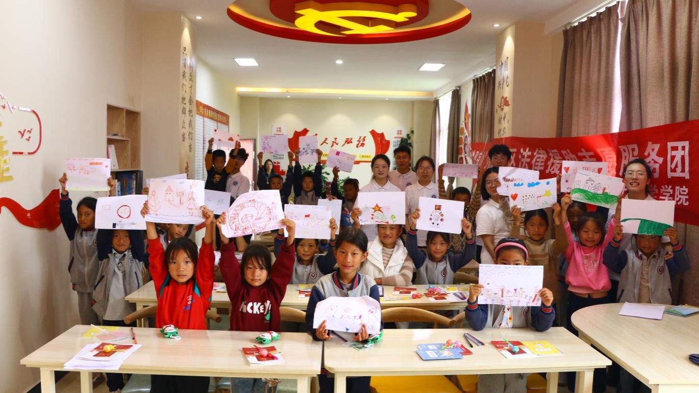 彝族大学生志愿者将凉山地区民谣改编为普法歌谣教唱,以彝韵伴普法,以法治暖人心。团队围绕《民法典》及《未成年人保护法》展开宣讲,带来以“反家暴”为主题的普法情景剧表演,从保障未成年人权益、预防未成年人犯罪等方面教会小朋友们演绎模拟法庭,在原告、被告、法警等角色的扮演中感受法庭审判程序,坚定社会主义法治信仰。宣讲结束后,大学生志愿者组织小朋友们开展反诈知识竞答活动,进一步提升青少年法治意识。小朋友们在志愿者的引导下绘制出“我心中的法治凉山”,用手中画笔描绘出凉山彝区的法治蓝图。
