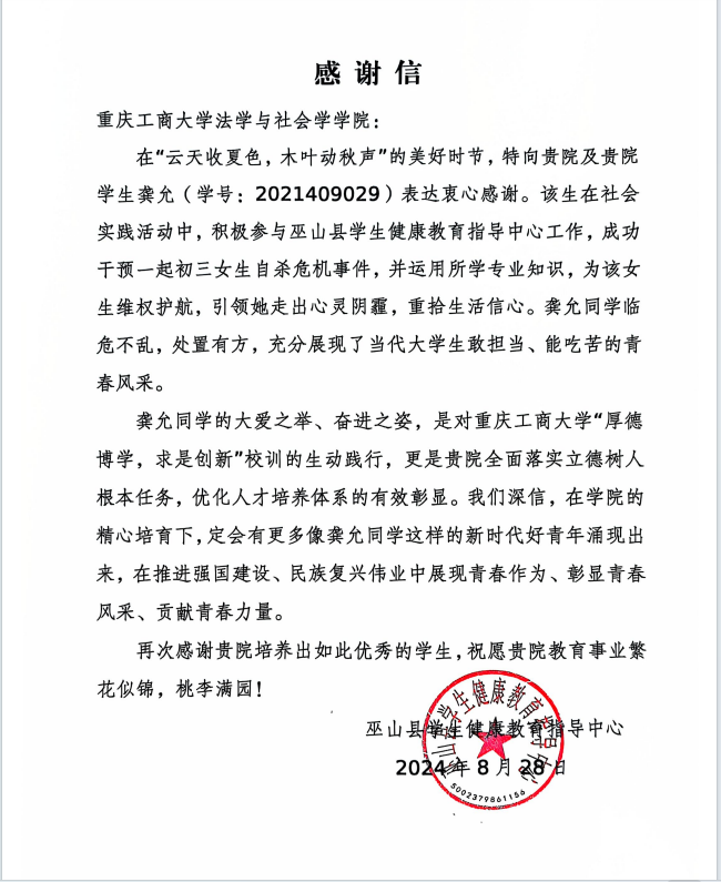 近日,学院收到来自巫山县学生健康教育指导中心的感谢信,感谢我院2021级学生龚允在社会实践活动中利用所学专业知识,成功干预了一起自杀危机事件,具体内容如下: