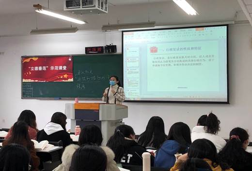 为切实开展“立德垂范”新老教师结对子、传帮带活动,提高教师教育教学水平。12月3日下午,ok138cn太阳集团开展了《行政法与行政诉讼法》 “立德垂范”示范课堂活动,由党员教师胡婧主讲。学院班子成员、新进教师、行政人员和部分党员教师参与了此次示范课活动。