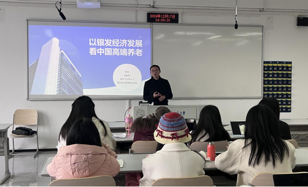 课堂上,雷老师全方位展示了银发经济的发展蓝图及其与高端养老的紧密联系。首先,他详细阐述了银发经济的具体要求,强调发展应既量力而行又尽力而为,推动市场与有为政府相结合,以实现银发经济规模化、标准化、集群化和品牌化发展,进而培育出高精尖产品和高品质服务模式。其次,在民生事业领域,雷老师列出了从扩大老年服务到提升农村养老服务等七大板块,充分彰显了银发经济在民生层面的广泛覆盖。同时,多样化需求下的潜力产业领域培育也备受关注,如强化老年用品创新、打造智慧养老新业态等,展现出了银发经济发展的多元化方向。此外,国家发改委、民政部、工信部和商务部等部门对银发经济发展的重点考虑也在雷老师的讲述中得以详细呈现。最后,雷老师结合泰康之家、万科和光大等高端养老机构的实例,深入浅出地分析了中国高端养老产业的现状与未来发展方向,为学生们带来了一堂极具启发性的课程,使学生们对银发经济和高端养老有了更深刻、全面的理解。