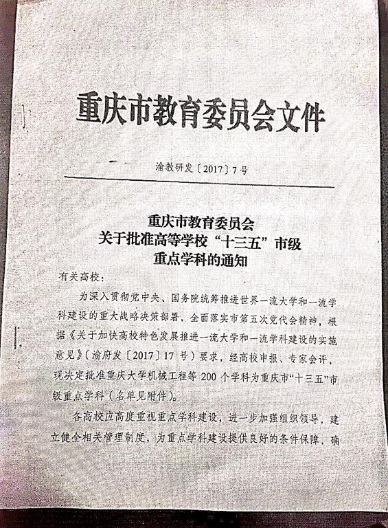 重庆市教育委员会发文公布了重庆市高等学校“十三五”市级重点学科评审结果(渝教研发[2017]7号)。我院申报的法学一级学科成为我校获批的十个重点学科之一。