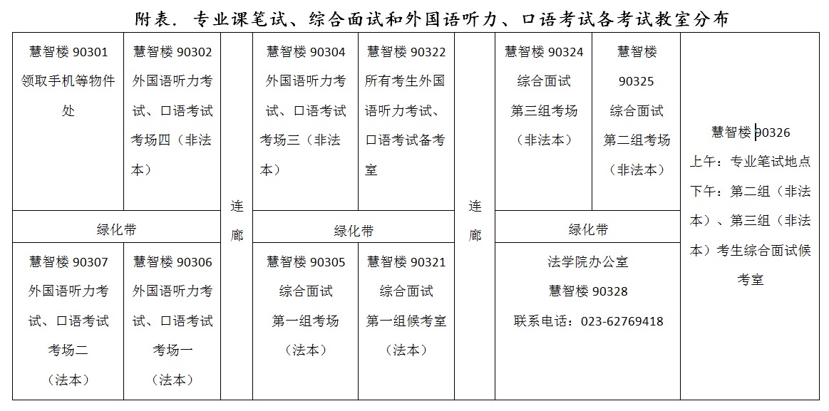 法学本科毕业考生在慧智楼90321教室候考,非法学本科毕业考生在慧智楼90326教室候考。结束综合面试的考生进行外国语听力、口语考试。其如需要等待外国语听力、口语考试,则均在慧智楼90322教室候考。慧智楼90322教室为共用外语考试候考室。教室分布见附表。
