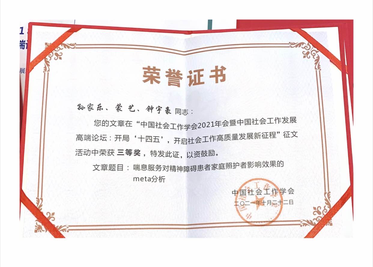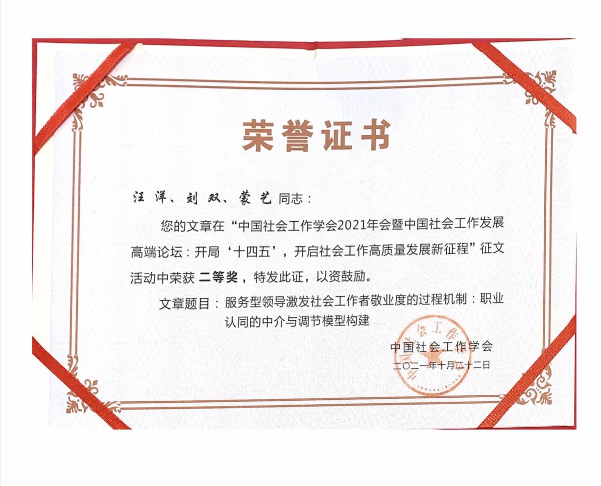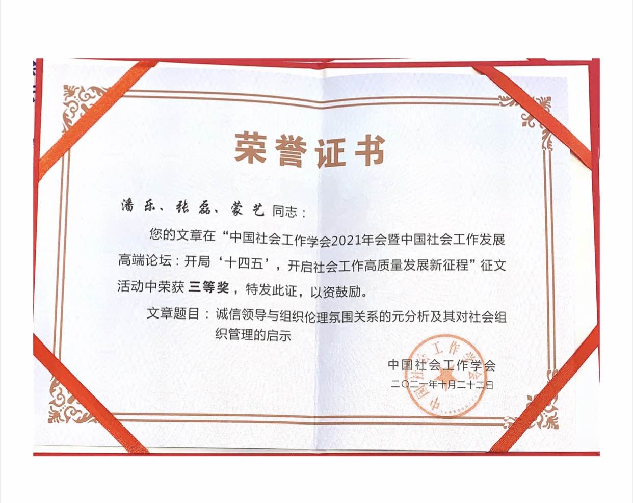 2021年10月22日,“中国社会工作学会2021年暨中国社会工作发展高端论坛:开局‘十四五’,开启社会工作高质量发展新征程”研讨会在浙江省宁波市成功召开。本次论坛由中国社会工作学会主办,浙江万里学院和宁波市社会工作协会承办,宁波万里对口协作和反贫困研究院、美亚联创(北京)科技有限公司等单位协办。此次论坛是中国社会工作专业最高级别的会议,有来自民政部慈善事业促进和社会工作司社会工作处长王铮健、中国社会工作学会会长王思斌教授、中国社会工作学会副会长关信平教授等知名专家学者均出席了本次盛会。经中国社会工作学会评审专家对来自北京大学、复旦大学、华东理工大学等全国高校社会工作专业老师和学生的投稿论文进行初选、复审,最终遴选出34篇优质论文。我校学子汪洋等六位同学分别获得4项奖项,其中汪洋同学、刘双同学合著作品获得年会征文比赛二等奖,孙家乐与钟宇豪合著作品、潘乐与张磊合著作品、张磊与赵雪花合著作品分别获得三等奖。指导老师均为蒙艺老师。