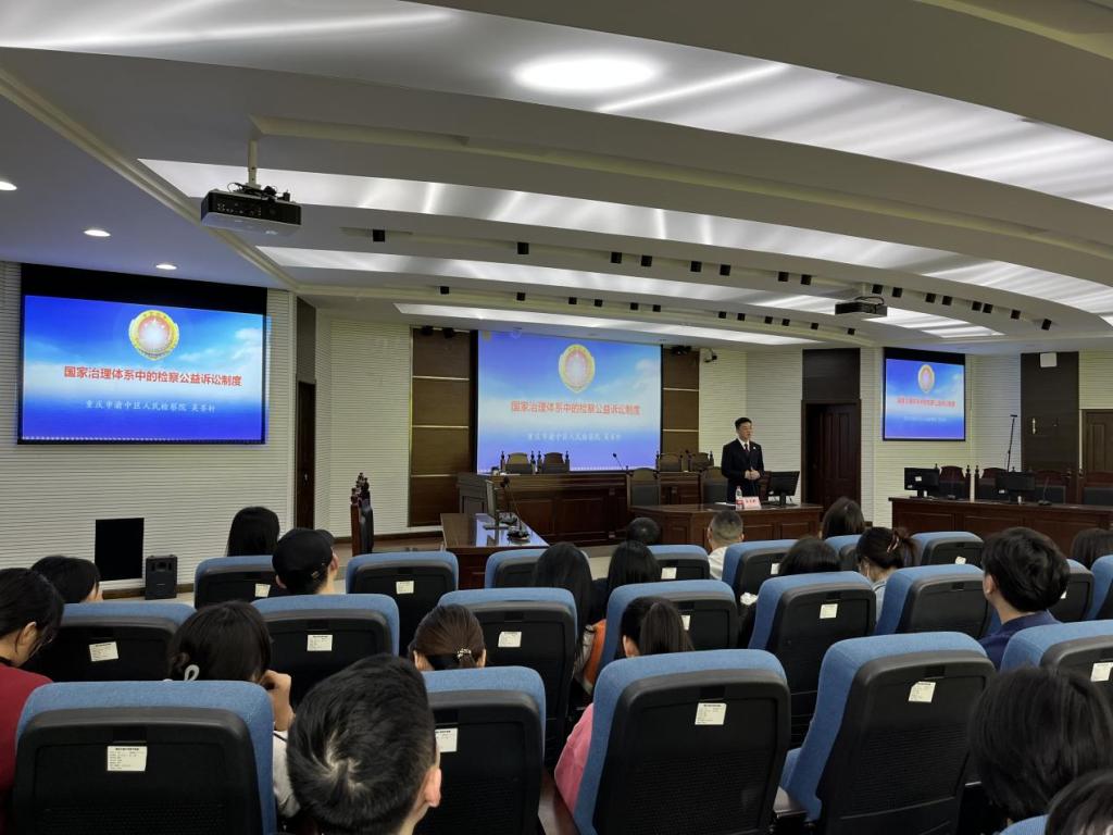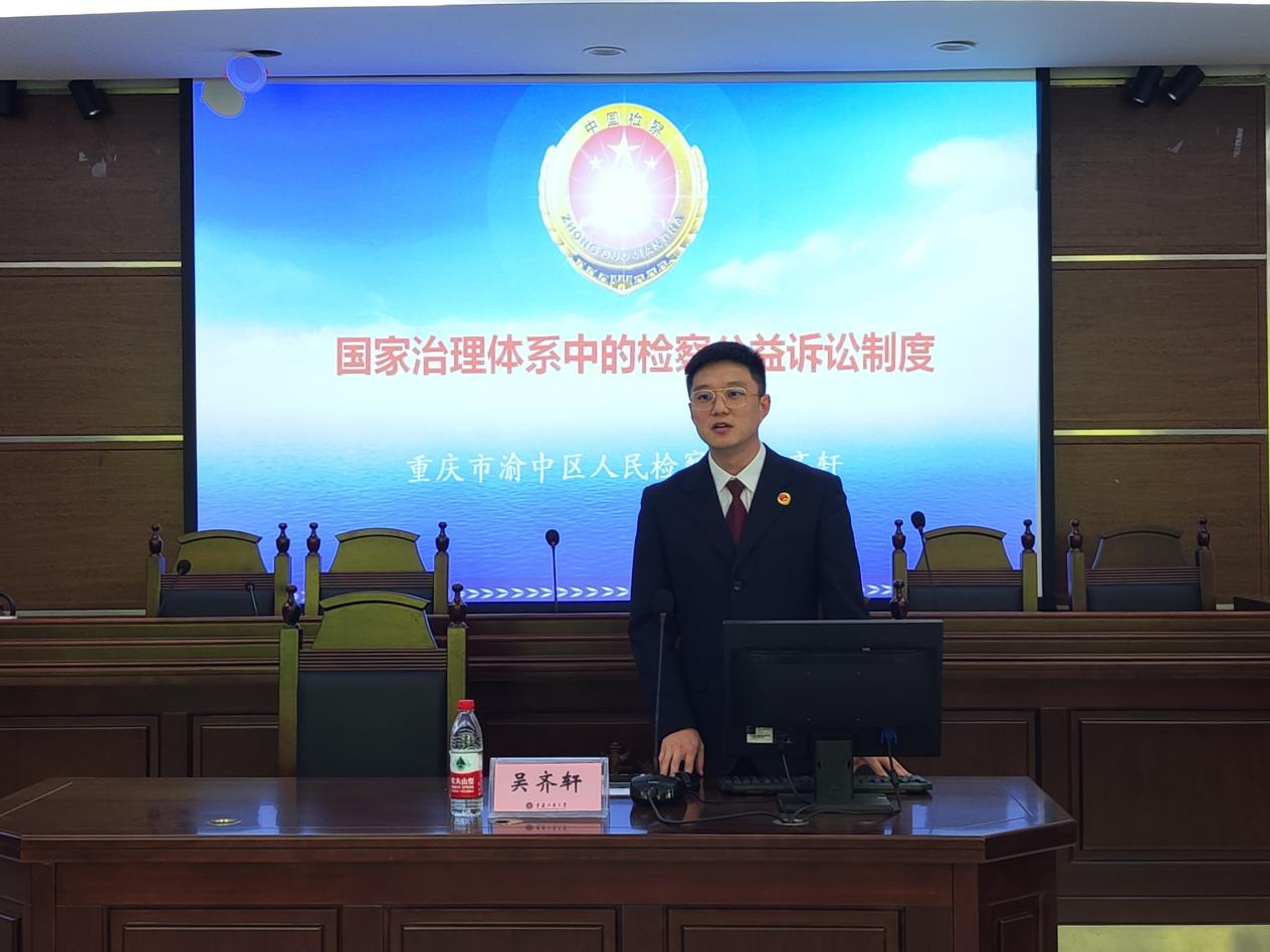 为了使学生们进一步了解国家治理体系中的检察公益诉讼制度,ok138cn太阳集团于2023年461600慧智楼模拟法庭举办国家治理体系中的检察公益诉讼制度”为主题的讲座。本次讲座由重庆市渝中区人民检察院检察五部副主任、二级检察官吴齐轩主讲,李喜燕教授主持渝中区检察院检察五部主任四级高级检察官彭皓,检察官助理官宁、商银桥,太阳集团tyc9728党政办副主任刘乃睿、ok138cn太阳集团副院长刘勇等到场交流,学院法学专业本硕学生参加讲座