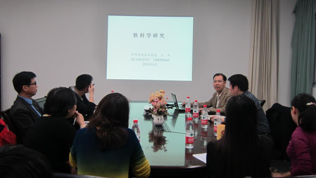 随后,王伟处长具体围绕重庆市软科学研究情况,着重向大家介绍了重庆市有关软科学研究项目申报改革后的情况,包括了支持方向、资助强度、申报要求等内容,最后,王伟处长向大家介绍了2013年度重庆决策咨询与管理创新项目的重点项目选题共20余项,特别提醒大家一定要结合自己的优势研究领域,紧扣申报指南,选好切入点,提出相关的应对措施、发展思路和决策建议。