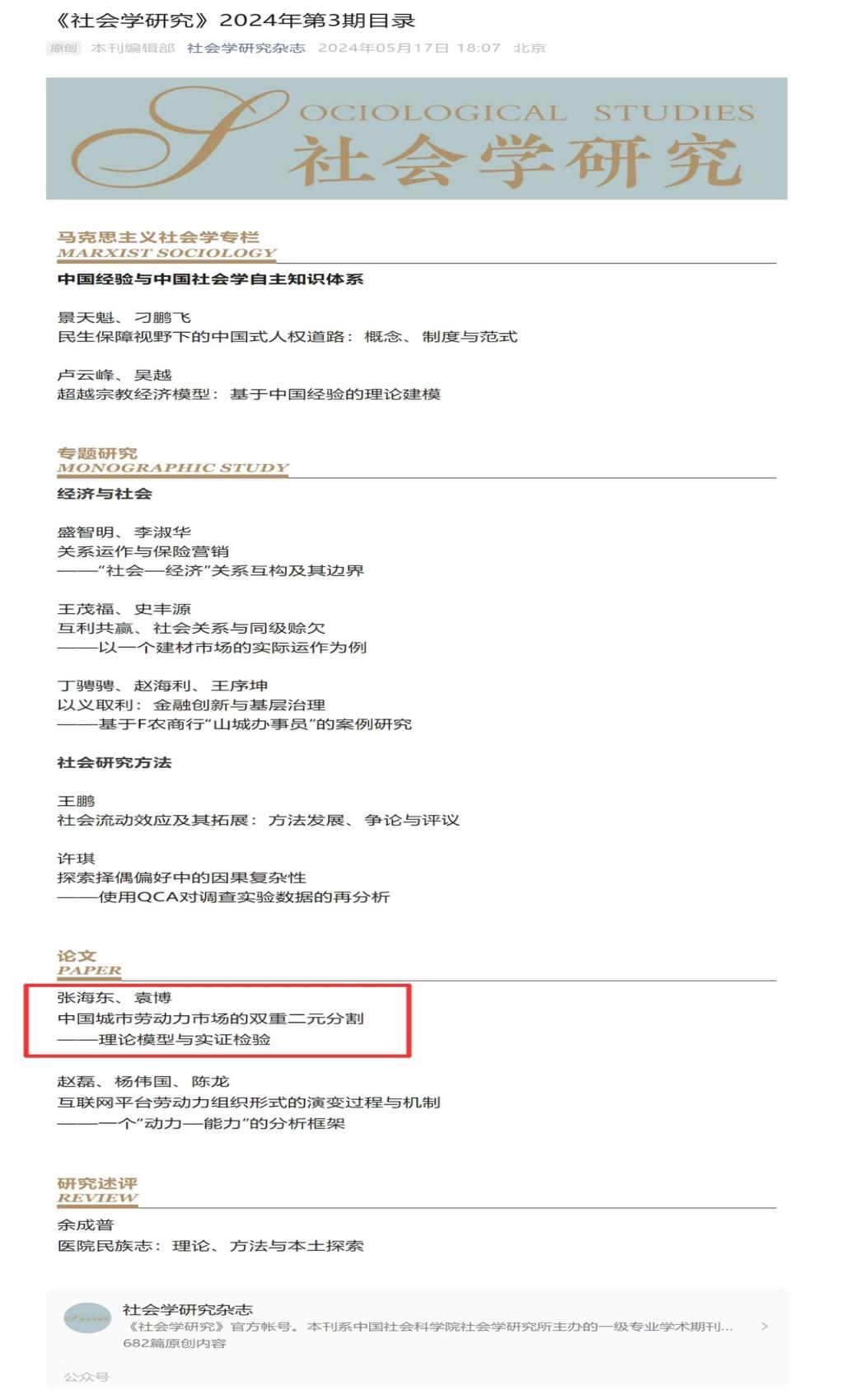 近日,我院袁博老师与上海大学社会学院张海东教授在《社会学研究》2024年第3期合作发表题为“中国城市劳动力市场的双重二元分割——理论模型与实证检验”的学术论文。该文系袁博老师主持的国家社会科学基金青年项目“新社会阶层的职业流动与政治信任研究”(23CSH081)的阶段性成果。《社会学研究》被我校认定为T2期刊,系社会学研究领域的中文顶级期刊。