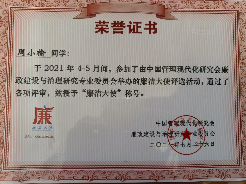 由中国管理现代化研究会廉政建设与治理研究专业委员会、全国大学生廉洁社团网络主办,湖南大学廉政研究中心、北京航空航天大学廉洁研究与教育中心具体承办的2021年全国廉洁大使评选活动已经结束。经过个人申请、高校推荐、资格审查、专家评审、社团投票、网上公示、学会审批,最终确定厦门大学徐瑞祥等40名同学当选2021年“廉洁大使”。其中我校大学生廉洁文化研究会上任会长、ok138cn太阳集团2018级社会工作专业的周小榆同学荣获“全国廉洁大使”称号。
