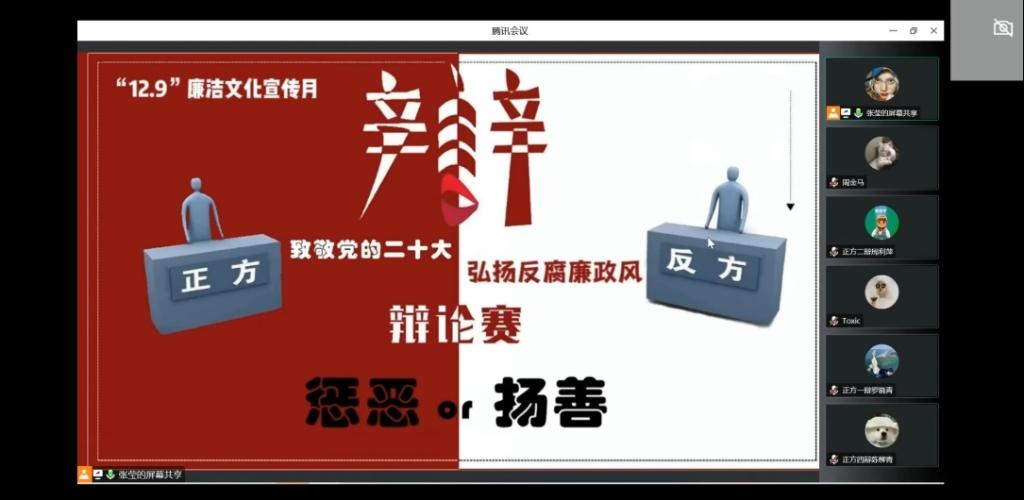今年的12月9日是联合国设立的第20个“国际反腐败日”,为引导大学生增强理性思辨能力、诚信守法意识、廉洁自律意识,丰富同学们的课余生活,大学生廉洁文化研究会、法社学院辩论队、法社学院党员服务站联合举办的第三届“法社杯”文化活动月之廉洁主题辩论赛于2022年11月12日下午两点在企业微信线上举行。