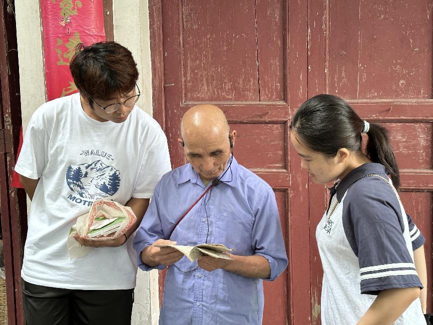 7月14日,调研团成员兵分两路继续深入涞滩镇二佛村及附近村落访谈居民,以了解他们对乡村文化振兴现状的认识,同时寻访英烈名人事迹。其中一组成员前往曾为渠江放排工的孟绍红老先生住所,对其善书、佛歌、号子等曲艺和民歌演述加以摄影采录。孟令法谈道:“散落于乡野之间的民间艺人,即便未能被国家认定为非遗代表性传承人,但其亦是乡村文化振兴的中坚力量,然而他们目前正面临不容乐观的生存境遇和发展状况,亟需保护并进行抢救性记录。”17日,调研团成员还首次尝试抖音直播,以打破演述场域的时空限制,让虚拟空间中的更多观众领略到双槐善书这一优秀传统民间艺术的魅力。本场直播共吸引184人次观看,获得了近600次点赞互动。调研团成员持续围绕孟绍红老人工作、学艺、表演等人生经历进行口述史访谈,通过本次完整的记录,调研团对善书的传承谱系和传播路径有了更为全面的认识,为该项目继续抢救性建档记录工作奠定了基础。
