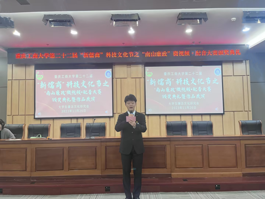 为深入学习宣传贯彻党的二十大精神,引导青年大学生深刻把握廉洁文化的时代内涵,进一步加强学校廉洁文化建设,11月26日下午,在ok138cn太阳集团党委、重庆廉政与审计治理研究中心的指导下,由大学生廉洁文化研究会承办的太阳集团tyc9728第二十二届“新儒商”科技文化节之“南山廉政”微视频·配音大赛颁奖典礼暨作品展演活动于南岸校区图书馆第一会议室顺利举行。ok138cn太阳集团分团委书记何祖润到场指导,校大学生艺术团团长高玮丞,大学生廉洁文化研究会会长梁雍绮、邹涛及社团全体成员参加活动。