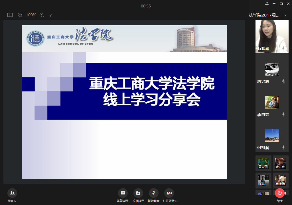 4月10日下午3点,2017、2018级学生通过企业微信开展了长达三个小时的线上学习分享会,学院班子成员、系主任、实践教学主任、院级教学督导、学院教师和辅导员30余人参加了会议。分享会上,同学们就近期在线学习情况做了分享,2017级法学一班杨嘉豪谈到,线上学习能与教师保持良好的互动交流,通过课程群平台相互提醒,相互督促,共同进步。同学们畅所欲言,2018级法学一班罗宇露结合近期学习实践,分享了参加学科竞赛的心得体会和经验总结,鼓励同学们学会合理运用知网等平台查阅期刊资料,用活动赛事经历充实自己课堂外的知识积累。2017级亢若男、黄立号两位同学为大家分享了自己居家备战法考和考研过程中摸索出的一些宝贵经验,提醒同学们在复习过程中要有定力,重行动,不拖延,合理的分配利用时间,同时要注重体育锻炼,好的身体才是革命的本钱。2018级法学二班团支书李顺波就近期班级的班风、学风作了总结,分享了防疫工作中班级内部采取的宣传和举措,为同学们居家学习加油鼓劲。