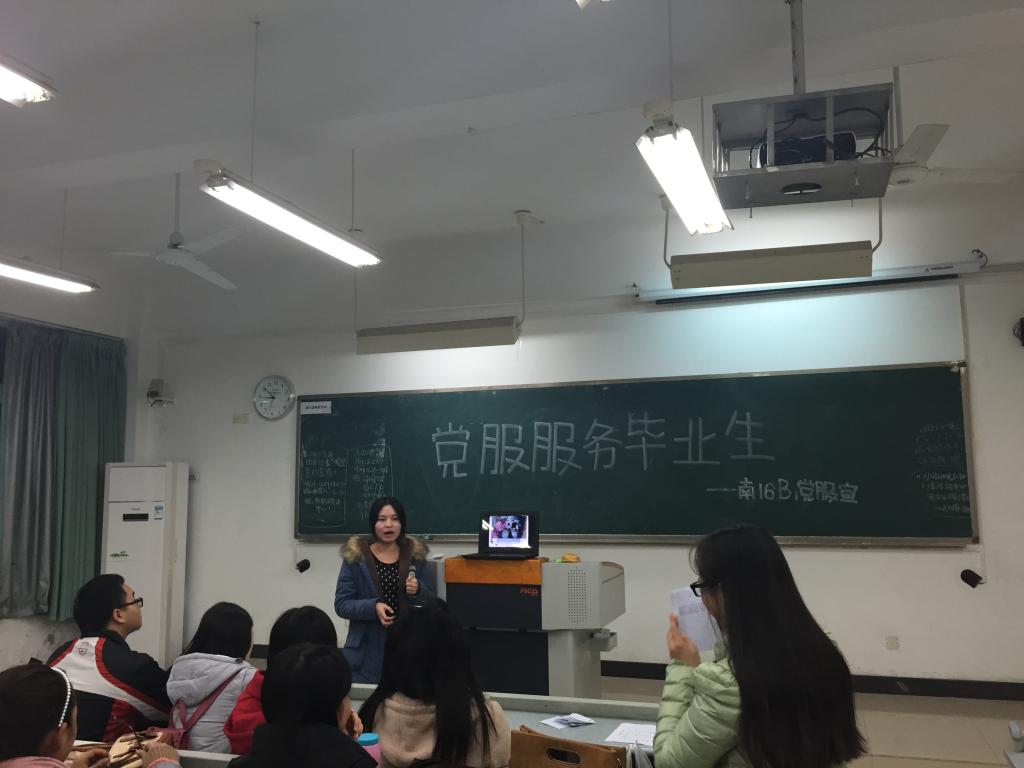 2014年11月28日晚上9点,南16B1党员服务站在慧智楼90224教室举办了以“党服服务毕业生”为主题的活动。作为嘉宾的大自委的两名同学、党服三个部门的部长及各部门干事参加了此次活动。