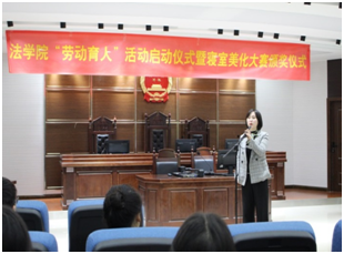 2019年4月4日中午,法学院劳动育人活动启动仪式暨“塑舍树人”首届寝室文化节表彰大会在慧智楼90426模拟法庭举行。启动仪式由法学院楼管会楼长伍思怡同学主持,法学院党总支副书记林璐、分团委书记罗观以及法学院楼管会全体成员及法学院的全体室长参加了此次活动。
