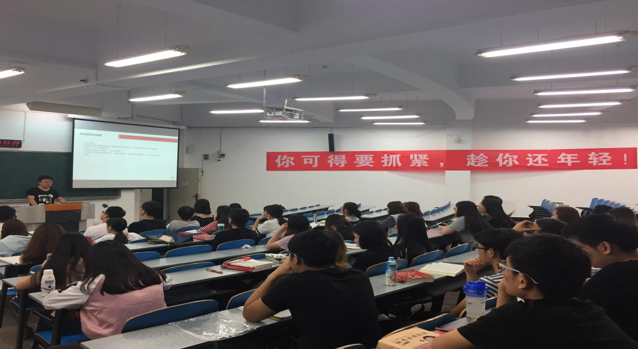 简书记首先对考研团的日常自习情况予以充分的肯定,随后对同学们的学习现状表示关心,了解了同学们所面临的困惑和难题,并鼓励同学们继续坚持,勤奋学习,克服困难。其次还简要地分析了今年学院考研的形势和动态,强调考研不仅要考高分,还要填好志愿,找对方向。简书记的谆谆教诲让在座考研团学子备受鼓励!接下来是13级宋树鹏同学带来的2017年学院上线落榜情况研究分析及自身学习经验交流。他指出,上线却又落榜的教训有“盲目制定过高目标”、“高估自身实力”、“精神懈怠,享乐思维作祟”、“只重视专业课或者公共课”、“只注重做题背书,不重视错题整理”、“哪个专业热门报哪个”、“闭门造车,以为自己很努力了”、“心浮气躁,易受干扰”、“吃不得苦,光想着玩”等,让同学们以此为警,备受启发;他认为,学习方法和技巧是成功考研的重要因素,建议同学们对知识进行总结和归纳,注意整理好错题集;他强调,考研科目分数构成也十分重要,建议专业课和公共课应该并重。并且还推荐比较实用的学习软件和网站,同学们受益良多。最后,简书记对此次经验交流会进行了总结,对宋树鹏精彩的分享交流表示感谢!鼓励同学们不忘初心,继续努力,争取今后考研成功!