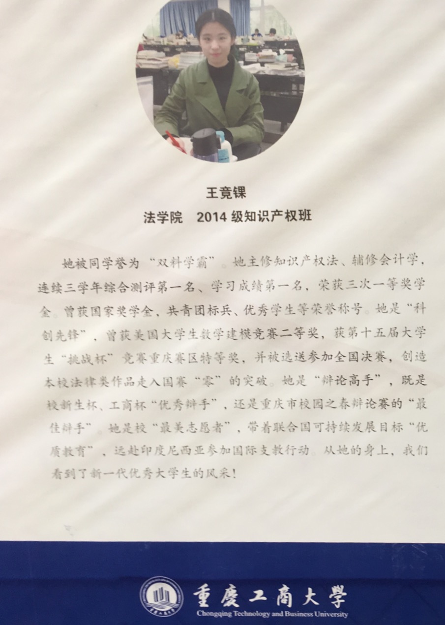 2017年12月4日下午,我校2017年校长荣誉奖颁奖典礼在博智楼7100报告厅隆重举行。我院2014级知识产权班学生王竟锞获得了该荣誉,并作为获奖学生代表上台发言。她表达了对我校的领导、老师、同学的感激,同时结合了自己的大学经历与学弟学妹们分享了两条经验:“走出舒适,遇到最好的自己”、“相信自己,点燃最美的青春”,倡导工商学子,在漫漫求索路上砥砺奋进,展现青年风采,谱写灿烂篇章。