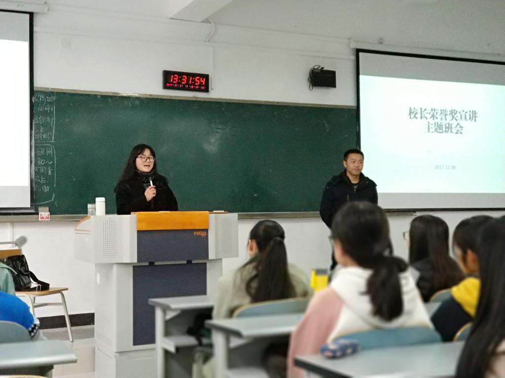 主题班会为三个内容。首先,同学们一起观看了2017年校长荣誉奖获得者先进事迹视频。六位获奖同学分别在学习成绩、科学研究、文体活动、社会公益等方面展示出高水平。接下来,各辅导员老师对此次获奖的法学院2014级知识产权班王竟锞同学的经历进行了详细解读,鼓励低年级同学们向优秀学姐、优秀榜样学习,规划好自身的大学学习和生活。最后,部分同学上台发言,分享了自己的感受,也励志努力进步,不断成长。