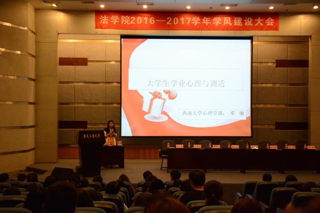 2017年5月24日19:00,法学院2017年心理健康月系列活动之——“大学生学业心理与调适”讲座在博智楼7100拉开了序幕,学院邀请到了西南大学心理学部发展与教育心理学专业邓敏博士开讲。法学院党总支部书记硕士生导师李自维教授、法学院党总支部副书记硕士生导师简福平副教授、学团办全体辅导员和法学院全体同学共计400余人参加了此次讲座。