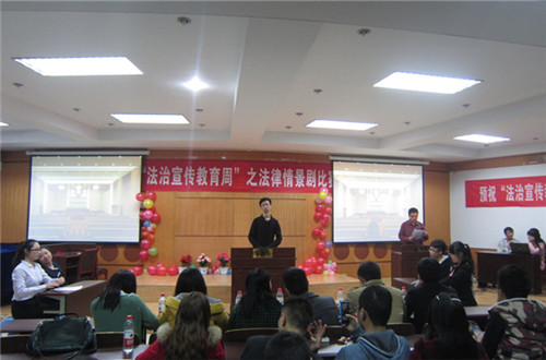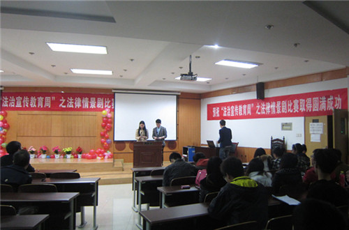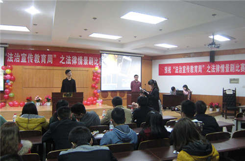 为了提高同学们的法律意识,贯彻落实党的十八大四中全会有关“依法治国”精神。由法学院学生会主办的“法律文化月之情景剧比赛”初赛于2014年11月23日在太阳集团tyc9728慧智楼模拟法庭举行。