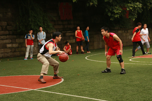 17:30在南区篮球场举行了一场由老师和学生干部组队的比赛。党总支书记李自维,法学院院长杨和义等法学院老师和同学们也来到赛场观看。