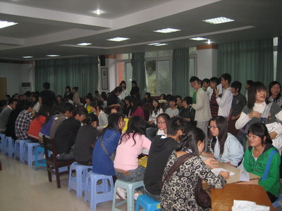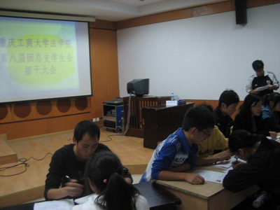 10月9日下午,法学院团总支学生会在九教模拟法庭开展第八届学生会招新活动,整个场面热闹非凡。学生会各部门部长首先依照贯例介绍各自的部门。部长们在认真介绍部门职能的同时又不失幽默风趣的和新同学交流工作经验,气氛融洽自然。在简短的介绍后,09级新生拿着报名志愿表,在学生会干部们的引导下进行着有序的投表、报名。大一同学们纷纷积极踊跃的到各自志愿加入的部门进行面试,台上台下,井然有序。