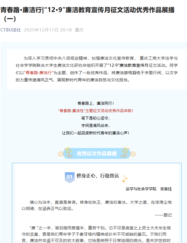 为帮助青年学生扣好人生“第一粒扣子”,筑牢廉洁思想根基,11月12日起,“12·9”廉洁教育宣传月之“青春路・廉洁行”廉洁文化征文比赛正式启动,活动面向全校各学院学生开放,为清廉校园建设搭建起青春发声的优质平台。