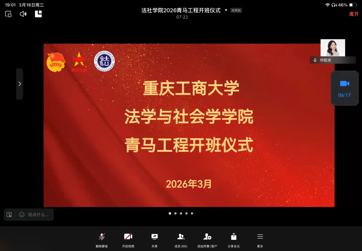 为进一步加强青年学生的思想政治引领,ok138cn太阳集团于2026年3月18日晚通过线上会议举办了2026年“青马工程”培训班开班仪式暨青年理论讲堂。本次开班仪式邀请到团市委高校工作部干部主讲,学院全体本硕团学骨干参会,会议由学院分团委书记何祖润主持。