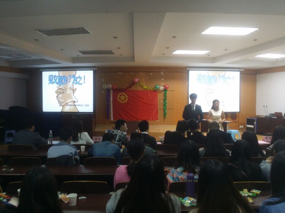 为发扬中华民族传统美德,2014级民商法二支部积极响应团委号召。2015年11月23日18:00—19:00,在模拟法庭90426开展了关于“坚强诚毅困愈挺,见义勇为敢担当”为主题的团日活动。