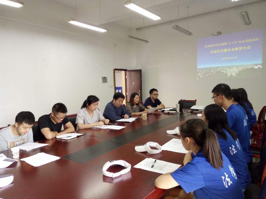首先,党总支书记李自维教授强调了本次“三下乡”活动的重要意义以及注意事项希望同学们可以在服务基层社区群众的实践中接触社会、了解国情,增强社会责任感和历史使命感通过“三下乡”社会实践活动改造世界观、价值观,把基层建设的需要和青年学生的成长很好地结合起来,走正确的成长成才道路。随后,社会实践团相关负责人介绍了活动的日程安排和筹备情况。最后由分团委书记杨婷老师对社会实践团成员进行安全教育,她要求大家一切行动听指挥,严格遵守活动纪律,积极发挥个人才智,体现法学院学生良好的能力素质和精神风貌。