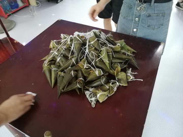 活动当天,志愿者们早早的来到活动现场,为随后的包粽子活动做着准备工作。大家把提前泡好的糯米、绿豆以及竹叶等材料整齐地摆放在桌子上。上午9点,活动正式开始,志愿者们大多都是第一次包粽子,老人们耐心的为志愿者们示范,手把手教他们包粽子;而志愿者当中也不乏包粽子高手,只见他先将棕叶卷成漏斗形,然后将糯米装进去,最后用细绳密密缠住,动作非常娴熟一气呵气。志愿者们渐渐学会怎样卷起粽叶,一个个不太规整的粽子慢慢成形,大大小小的粽子堆成了小山,盛满了老人和志愿者们的欢笑。考虑到老人肠胃消化功能不及年轻人,200多只粽子多以纯白糯米馅、绿豆糯米馅为主,社区的工作人员将会在端午节期间送给每位老人,陪伴他们过上一个有爱、有滋味的假期。