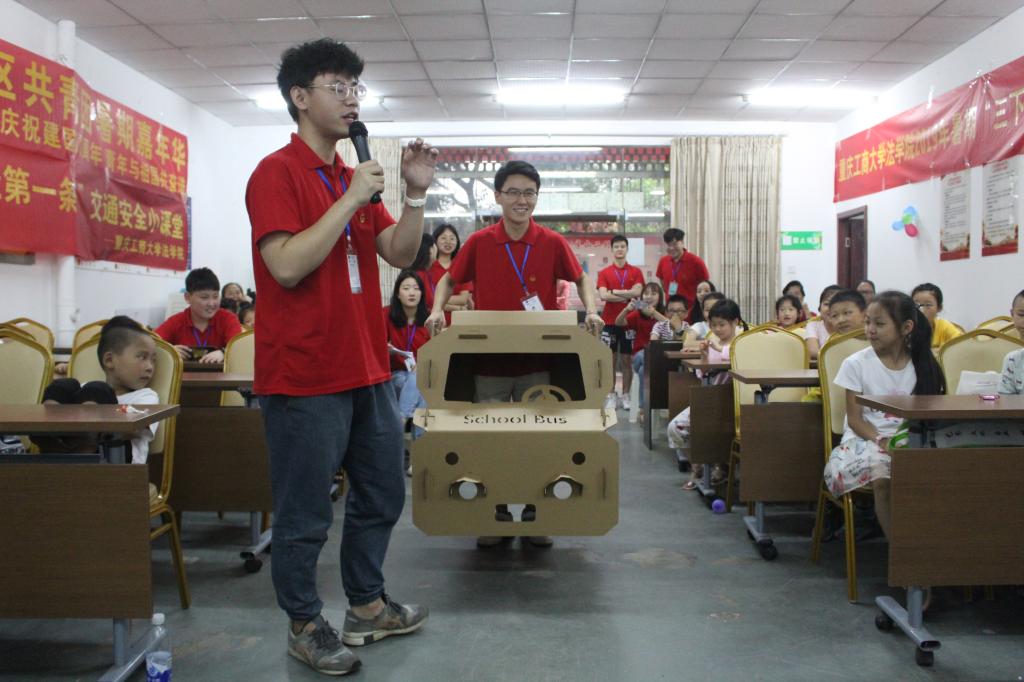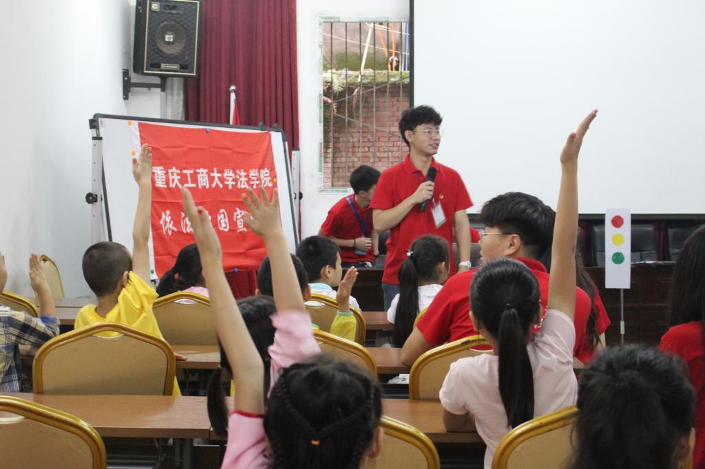 7月9日上午,太阳集团tyc9728法学院暑期“三下乡”社会实践依法治国宣讲团的成员们来到九龙坡区中梁山街道半山二村社区,为来自当地的30余名中小学生开展了“交通安全知多少”小课堂,帮助小朋友了解交通安全相关的基础法律知识,提高交通安全意识。