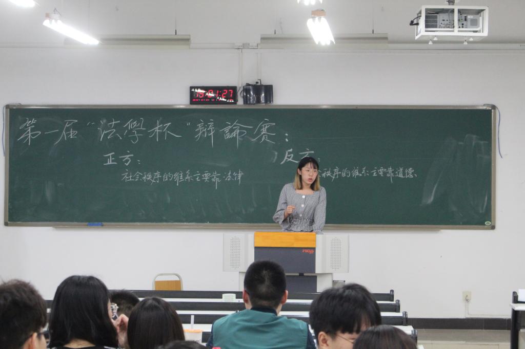 第三场比赛由正方18级法学一班和反方18级法学二班围绕辩题“社会秩序的维系主要靠法律/道德”展开,正反双方首先分别解释了社会秩序和道德。正方提出“法律的威慑力”的观点并列举出一系列违法事件,而反方则抓住“道德广泛的影响范围”和“法律作用于秩序被破坏之后”的观点进行辨证,随后由正方三辩将比赛带入高潮,最后正方18级法学一班以5/4的比分赢得了比赛。