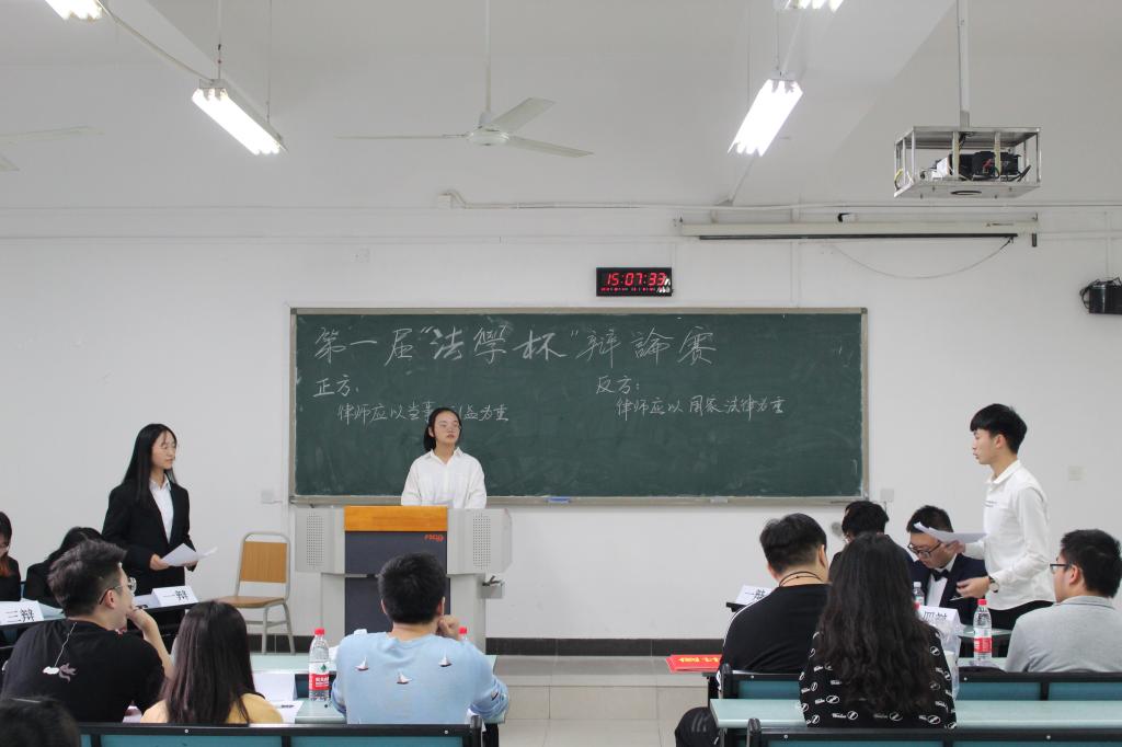 第二场比赛,正方19级法学三班和反方19级法学二班以“律师应当以当事人/法律为重”为辩题展开,正方提出“律师有义务忠诚于当事人的诉求”的观点,反方提出“律师以法律为重更利于建设法治社会、维持公平正义”的观点,在一番唇枪舌战之后,正方19级法学三班以7/2的比分获得胜利。
