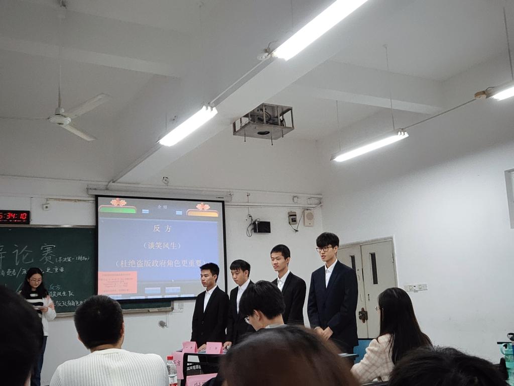 初赛胜利后,法学院辩论队与环资辩论队在半决赛相遇,压力只增不减。随着当今经济文化的飞速发展,人们对知识急迫地需求,这便给了盗版可乘之机,不法商家以及人们的法律意识浅薄,使得盗版现象愈加猖獗。法学院的观点是“杜绝盗版政府更重要”,环资学院的观点是“杜绝盗版消费者更重要”。双方的焦点主要围绕于“对于解决盗版问题,是政府的解决效力更好还是消费者”以及“两者之间何者更具有全面性”,就此展开激烈的辩论。各位辩手措辞精辟,言辞犀利,气势显得咄咄逼人,双方互相争锋相对。给观众带来一场视听盛宴。最后,法学院辩论队止步于半决赛,但虽败犹荣。对于新队员们而言,这也是一次宝贵的实战经验,唯有曾经失败,才更能体会成功的来之不易。